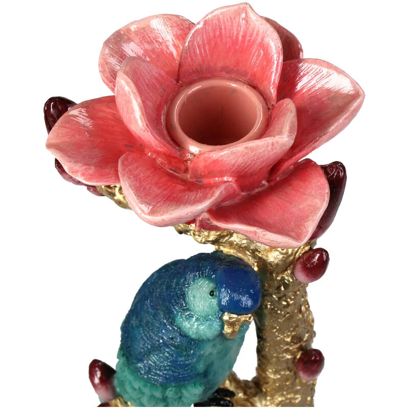 Add color and charm to your interior with this enchanting candlestick, featuring a beautiful blue bird and a red rose. Standing at 27 cm tall, it’s an elegant and eye-catching decoration that enhances any room. Made from sturdy polyresin, the candlestick offers both durability and stability. Its playful design adds character and warmth to any space. Perfect for a dining table, windowsill, or as a statement piece in your living room. Combine it with other colorful accessories or let it shine as a standalone feature. Suitable for standard candles, ideal for creating a cozy atmosphere. A perfect and original gift for any occasion!