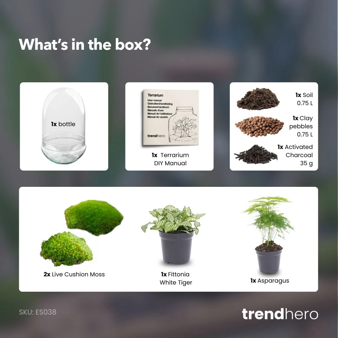 Our Do-It-Yourself (DIY) plant terrariums are delivered as a DIY kit. After receiving it, you can easily assemble your new green friend using the included 5-step plan.