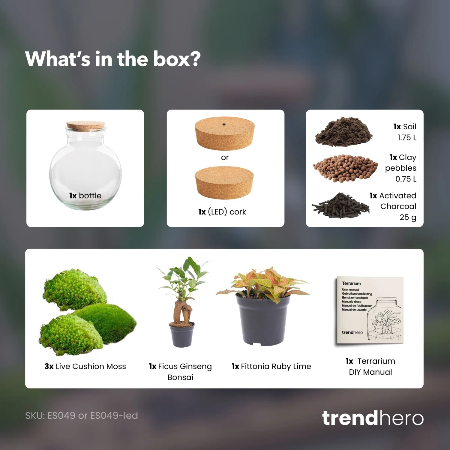Our Do-It-Yourself (DIY) plant terrariums are delivered as a DIY kit. Upon receipt, you can easily assemble your new green friend using the included 5-step plan.